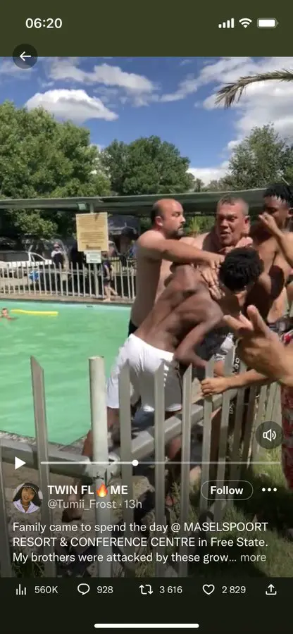 There is a video that trended on social media that has left many people in shock and talking. The video was about a bunch of racist white men who were seen choking two black teenage boys and also pulling them around by the hair after they were refused entry into a pool at Melspoort Resort just outside of Bloemfontein.