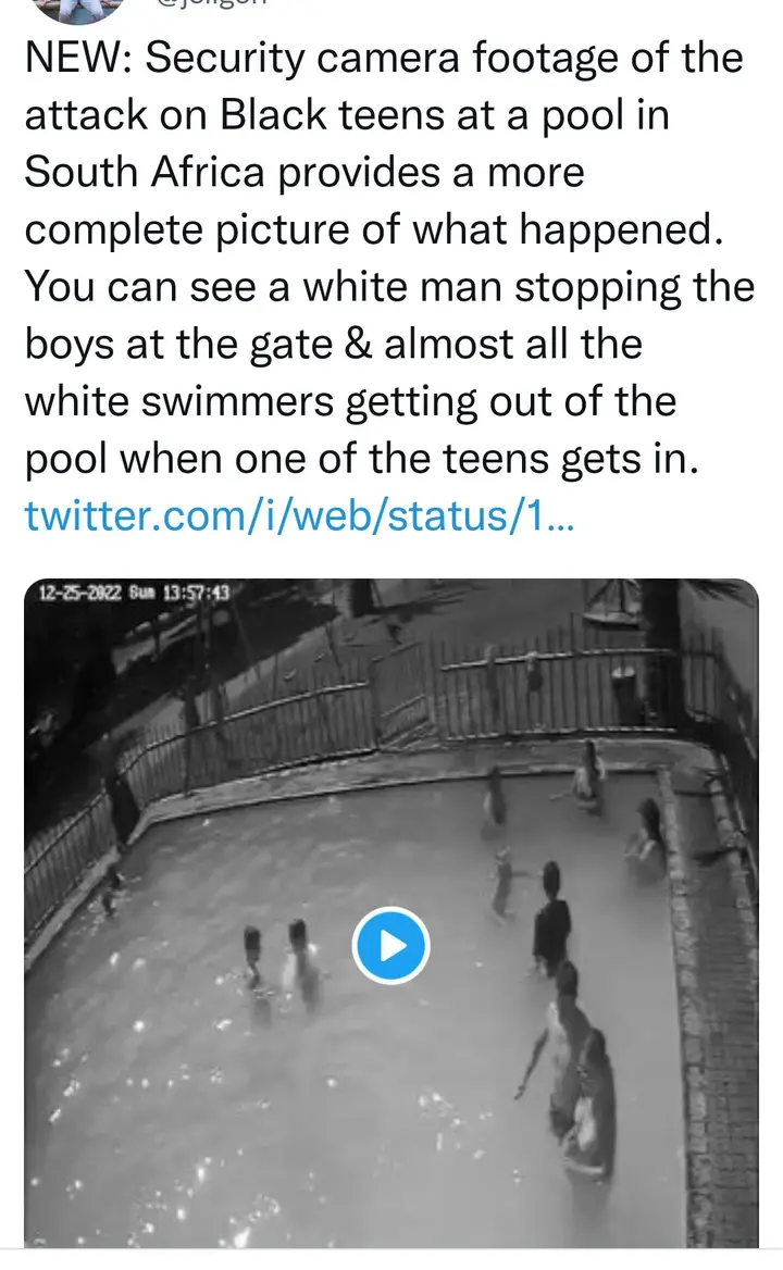 The CCTV footage shows that a bunch of white people were swimming at the pool, and when the two black boys arrived at the gate, the white men approached them. and when one black boy jumped into the pool, the rest of the white people stepped out, and then they attacked them. In the CCTV revealed, there was no evidence of a 3-year-old being thrown into the pool as they claimed.