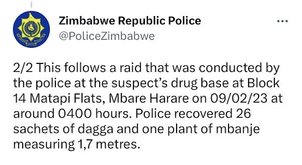 “Members of the Police deployed on operation, ‘No to cross border crimes’, arrested Zenzo Mangena (38) at Bubi road block, along Beitbridge Masvingo Road, for illegal possession of dagga.