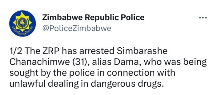 In a statement, the Zimbabwe Republic Police said Chanachimwe was arrested after police raided his place in Mbare on the 9th of this month and found 26 sachets of dagga.