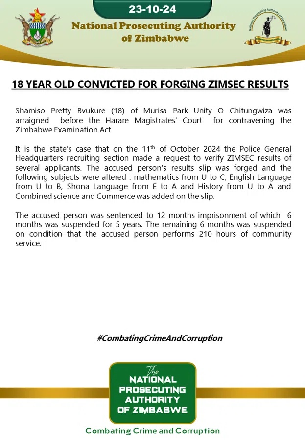 An 18-year-old girl, Shamiso Pretty Bvukure of Chitungwiza was convicted for forging Zimbabwe School Examination Council (ZIMSEC) results.