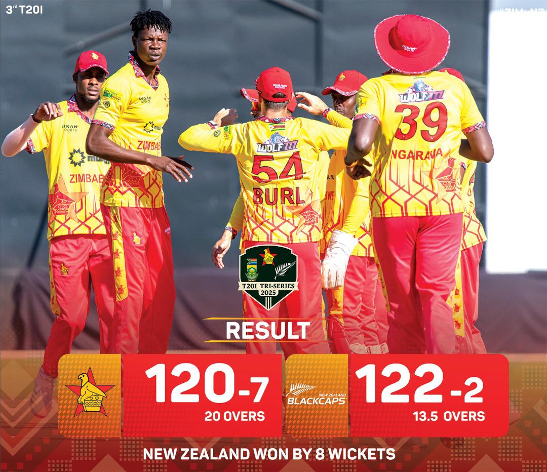 Put in to bat, Zimbabwe posted a modest 120 for 7 in their 20 overs despite a promising start. In reply, the Black Caps chased down the target with ease, reaching 122 for 2 in just 13.5 overs, led by a fluent 59 not out from Devon Conway, who was named Player of the Match.