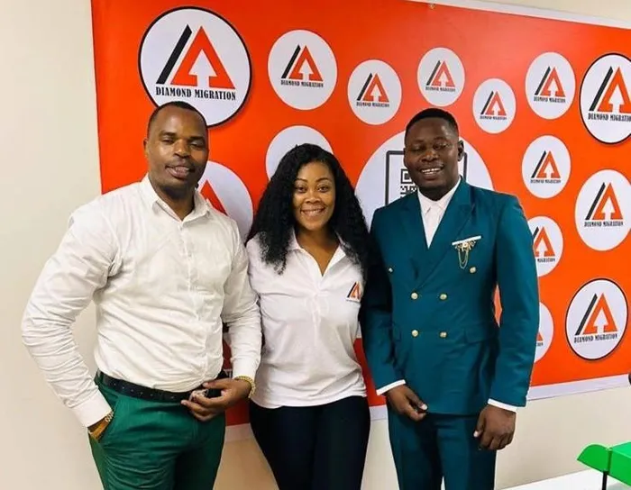 Alleged fraudster Evans Sivechere, also known as Vecco Lupa, is seen on the right at Diamond Migration’s Midrand office with Zimbabwean socialite Tarisai Chikocho — popularly known as Madam Boss — who previously endorsed the immigration consultancy brand, and Elson Musinavanhu (left).