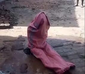In the video, the father is seen holding a log while confronting his daughter, whose body is wrapped in sacks, leaving neither her upper body nor legs visible.