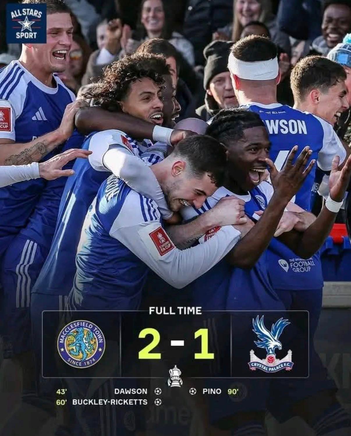Non-league Macclesfield FC today dumped holders Crystal Palace of the Premier League out of the FA Cup in the biggest shock of all time.