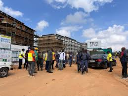 The site signage shows the company name as Tri Star. When police arrived, some of the workers reportedly tried to run away.